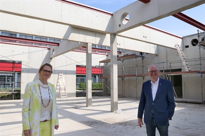 Die Arbeiten an der neuen Aula für das Kuniberg Berufskolleg in Recklinghausen gehen zügig voran. Bereits jetzt sind rund 90 Prozent der Vergaben der Arbeiten an dem zukünftigen multifunktionalen Forum abgeschlossen. Schulleiterin Michaela Korte und Landrat Cay Süberkrüb konnten sich nun ein Bild von den aktuellen Baumaßnahmen machen. „Bereits der Rohbau lässt erkennen, dass hier für die Schule etwas Besonderes entsteht“, so Landrat Süberkrüb.