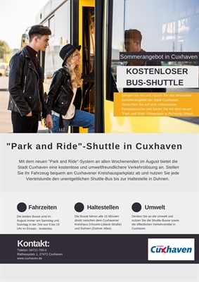 Urlaub im eigenen Land wird bei den in Deutschland lebenden Menschen immer beliebter. Ob in der Großstadt, in den Bergen oder an der Küste: Die Besucherzahlen wachsen stetig an und somit auch der Verkehr auf den Straßen. Aus diesem Grund hat die Stadt Cuxhaven nun ein Pilotprojekt ins Leben gerufen. Mit einer umweltfreundlichen Sommeraktion startet die Stadt Cuxhaven in den August. An allen Wochenenden des Monats – jeweils samstags und sonntags – stellt Cuxhaven einen kostenlosen Bus-Shuttle vom Kreishaus in den bei Urlaubern und Tagesgästen beliebten Kurbereich Duhnen zur Verfügung. Reisende können somit auf eine zeitintensive Parkplatzsuche verzichten und mit dem „Park and Ride“-Shuttle entspannt in Richtung Urlaub oder Tagestrip starten.