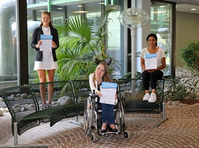 Schülerinnen und Schülern der 9. und 10. Klasse bei der Orientierung unter die Arme greifen, eigene Erfahrungen weitergeben und ihnen als Coach zur Seite stehen – das haben drei aktuelle und ehemalige Azubis des Kreises Recklinghausen gemacht. Im Projekt „ZukunftsBande“ ließen sich Annika Küper (l.), Jana Ribbeheger (m.) und Sarah Masbough (r.) zu Zukunftscoaches ausbilden. „Das war ein gute Erfahrung für mich“, berichtet Ribbeheger. „Ich kann es jedem Azubi empfehlen, dabei mitzumachen.“