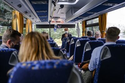 Für rund 30 Investoren, die sich für die Tour von Bochum über Marl nach Herne angemeldet hatten, hieß der zweite Stopp: gate.ruhr. Bereits auf dem Weg mit dem Bus – natürlich unter Berücksichtigung aller Hygieneregeln – in die Stadt am Rande des Ruhrgebiets gab es Input von Peter Haumann, Fachbereichsleiter Umwelt, Verkehr, Geoinformation, Planung und Wirtschaft beim Kreis Recklinghausen. Er stellte sowohl den Interessenten aus dem Umland als auch den weiter angereisten Investoren den einwohnerreichsten Kreis Deutschlands vor. „In der Emscher-Lippe-Region finden Unternehmer ein enormes Marktpotential. Innerhalb des großen Kreisgebiets, aber auch angrenzend mit den insgesamt gut 5,1 Millionen Bewohnern des Ruhrgebiets. Ein weiterer Pluspunkt ist die infrastrukturelle Ausstattung und großen Zahl hier ansässiger Unternehmen aus allen Branchen“, weiß der Wirtschaftsförderer.