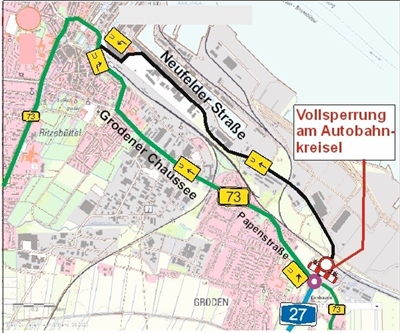 Eine Umleitung über die B 73 - Papenstraße - Grodener Chaussee - Meyerstraße zum Hafen wird für beide Verkehrsrichtungen ausgeschildert (siehe unten).