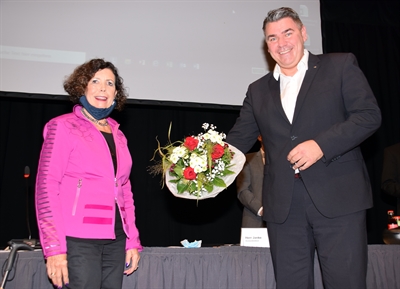 Bildzeile 1: Altersvorsitzende Ursula Schmidt (links) und Landrat Mario Löhr nach der Vereidigung im Kreistag. Foto: Birgit Kalle – Kreis Unna
