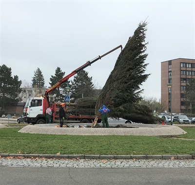 Im Kreisel Dettinger Straße hat HIS in diesem Jahr den ersten von 26 Weihnachtsbäumen aufstellen lassen.