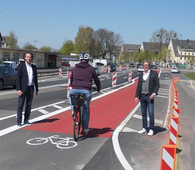 Stadtrat Thomas Morlock (rechts) und HIS-Betriebsleiter Markus Henrich begutachten am Pioneer Park den neuen Pop-Up-Radweg am Fahrbahnrand und dessen rote Markierung, die im Kreuzungsbereich erhöhte Aufmerksamkeit seitens der motorisierten Verkehrsteilnehmenden signalisiert.