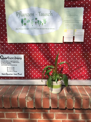 Neue Blumen für den Balkon oder Garten gesucht? An der alten Zimmerpflanze satt gesehen? Bei der Gartenarbeit sind Setzlinge und Saatgut übriggeblieben? Die Pflanzentauschbörse vor dem Quartiersbüro verschafft Abhilfe. Alle Pflanzen, ganz egal ob Zimmer- oder Gartenpflanzen, können dort abgestellt werden und gegen eine neue Pflanze für zu Hause eingetauscht werden. Wichtig ist, die mitgebrachte Pflanze beim Abstellen auf der Tauschbank mit einem Sticker zu markieren. Durch die Markierung erkennen potenzielle Tauscher:innen, ob es sich um eine Zimmer- oder Gartenpflanze handelt. Die Sticker stehen vor Ort zur Verfügung. Es können auch Setzlinge, Pflanzenableger oder Saatgut getauscht werden.