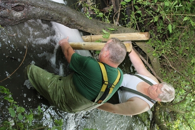 So war Einfallsreichtum gefragt, und den hatten die beiden Feldschützer Jürgen Minnert und Uwe Achtert von der Unteren Naturschutzbehörde: Wie es der Zufall wollte, hatte der städtische Bauhof ein Kunststoffrohr mit sechs Meter Länge und 20 Zentimeter Durchmesser über. In das sägte Minnert seitlich einen 100 Zentimeter langen und sechs Zentimeter breiten Schlitz ein und bohrte mehrere größere Löcher auf der oberen Rohrseite. Diese Öffnungen dienen dem Bachwasser-Durchfluss, denn die höher gelegene herkömmliche Rohöffnung verschloss er beim Einbau mit einem am Rohr fixierten herkömmlichen Plastik-Umtopf. „Damit wollen wir vermeiden, dass der Biber in das Rohr schwimmt und nicht wieder rauskommt“, erläutert Dr. Elisabeth Görge, Fachfrau von der städtischen Naturschutzbehörde.