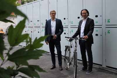 Die Hälfte der Boxen ist mit einer Lademöglichkeit für Elektroräder versehen. An den Fahrradbügeln lassen sich auch Lastenräder oder Trikes gut sichern.