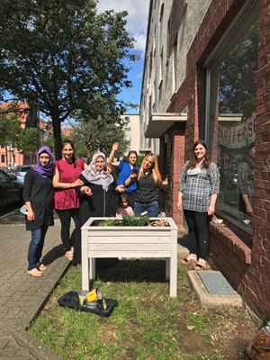 Bewohnerinnen aus dem Freigerichtviertel haben gemeinsam mit dem Quartiersmanagement vor Ort ein Hochbeet mit insektenfreundlichen Pflanzen bepflanzt. Zusätzlich befestigte die Gruppe ein Insektenhotel an einem nahegelegenen Baum. Die Zeilsetzung: den Platz vor dem Quartiersbüro aufwerten, dem Stadtgrau entgegenwirken und die Artenvielfalt heimischer Insekten fördern.