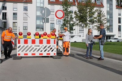 Gerhard Friedmann, David Cassaro und Sven Berens (von links) vom städtischen Bauhof stellten Absperrschranken und neue Verkehrsschilder auf. Rechts Heidrun Hess vom Bauhof und Walter Siebenhüner von der Straßenverkehrsbehörde.