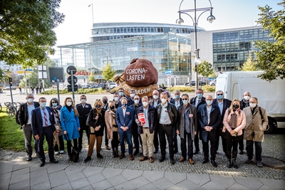 CDU/CSU, SPD, Grüne, FDP und Linke haben kürzlich Besuch von einem Esel und Vertreter:innen von 70 Städten und Kreisen erhalten. Der Esel war überlebensgroß auf einem Wagen zu sehen und trug gewaltige Säcke auf dem Rücken, die ihn in die Knie zwingen. Die Vertreter:innen der Kommunen überreichten den Parteien symbolisch einen Stein aus dem Lastensack. Darauf steht, dass Deutschland für seine Zukunftsaufgaben handlungsfähige Kommunen braucht. Die Kämmerin der Stadt Cuxhaven, Andrea Pospich, war auch wieder in Berlin präsent. Sie hat mit dem Oberbürgermeister der Stadt Wuppertal, Uwe Schneidewind, vor der Bundesgeschäftsstelle von Bündnis 90/Die Grünen unter anderem an Stefan Wenzel, ehemaliger Niedersächsischer Minister für Umwelt, Energie und Klimaschutz, und nun frisch gewähltes Mitglied des Deutschen Bundestages, einen Stein mit folgender Inschrift übergeben: „Das ist in Stein gemeißelt: Klimaschutz gibt es nur mit handlungsfähigen Kommunen“. Hinter der Aktion steckt das Bündnis „Für die Würde unserer Städte“, das damit auf die schwierige Lage vor Ort aufmerksam macht. Die Kommunen wären handlungsfähig, wenn die folgenden fünf Punkte Wirklichkeit werden: