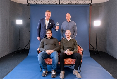 Freuen sich über die Anerkennung und den Pokal: Hanaus Oberbürgermeister Claus Kaminsky (hinten, links), Lutz Hanus (we are dn*/digitalnaturals*; hinten, rechts), Leon Herche (bright!studios; vorne links) und Kevin Kenntemich (Soundhouse Hanau).