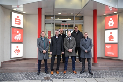Treten gemeinsam für eine gute Energieberatung ein: Cliff Hollmann und Andreas Gramlich von der Sparkasse Hanau, Energieexperte Marco Lachmann, der städtische Klimaschutzmanager Sebastian Nellies Nellies sowie Mirco Budeck und Alois Blos von den Stadtwerken Hanau (von links).