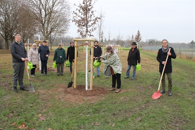 Stadtrat Thomas Morlock (ganz rechts) freut sich im Kreis der Spendierenden über 18 neue Baumspenden für das Bürgerwäldchen.