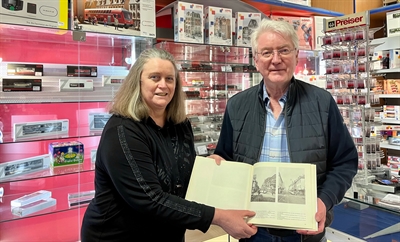 Spielwaren-Brachmann an der Ecke Rosen-/Salzstraße blickt auf eine über 175-jährige Geschichte zurück. Die Inhaber Marina und Edgar Lülow zeigen einen Bildband, der den Laden Anfang des 20. Jahrhunderts in einer Ansicht von der Salzstraße zeigt. Das Ehepaar übergibt das Traditionsgeschäft Ende Juni an die Hanau Marketing GmbH.