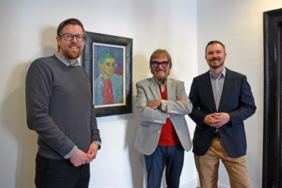 BZ1: Sammler Frank Brabant (Mitte) und die Kuratoren der Ausstellung Arne Reimann (links) und Wilko Austermann (rechts) mit der Ikone der Ausstellung „Lettisches Mädchen“ um 1911 von Alexej von Jawlensky. Foto: Anita Lehrke – Kreis Unna