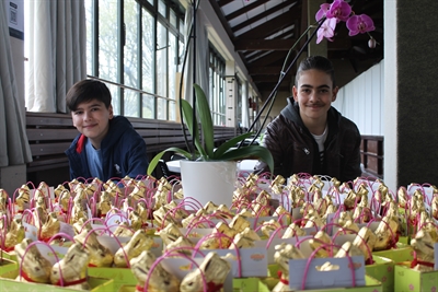 Für die verzichtete Josua Mitte März auf eigene Geburtstagsgeschenke und sammelte stattdessen mit Elternhilfe unter Freunden, Familie, Bekannten und Geschäftsleuten Geld für Geschenke an junge Geflüchtete – passend zum orthodoxen Osterfest am 24. April. Und so sind bei der Spendenübergabe in der Mehrzweckhalle auf einem Tisch 80 Schokohasen-Paare aufgebaut, jeweils ergänzt um einen 20-Euro-Einkaufsgutschein bei Globus.