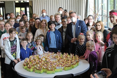 OB Claus Kaminsky (neben Josua und mit Maske) bedankt sich für die 80 Ostergeschenke.