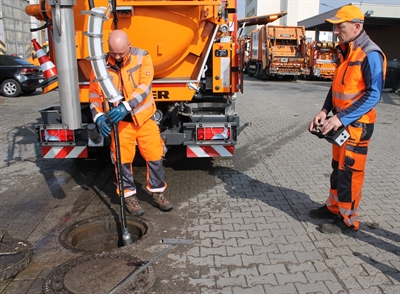 Die neue Technik des Spülwagens mindert übrigens auch die Gesundheitsgefahren für das Fachpersonal: Dank der flexibel handhabbaren Fernsteuerung in der Hand können sie ein Stück weiter weg vom Kanalschacht stehen, wenn Schmutzstoffe abgesaugt werden. Früher seien ihnen schon mal Fäkalien buchstäblich um die Ohren geflogen, weil die Steuerung in der Nähe des Saugrohrs fest am Fahrzeug montiert war, berichten sie.