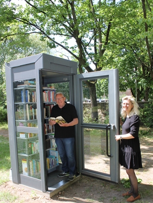 Die Leiterin der städtischen Friedhofsverwaltung ist erfreut zu sehen, dass schon kurz nach dem Befüllen der Regale erste Bücher aus der Telefonzelle mitgenommen worden sind. In der untersten Reihe sind jede Menge Kinderbücher für Jungen und Mädchen gut herausnehmbar, um zu schmökern. Ganz oben liegen Bildbände verschiedener Buchspender. Und zwischendrin Weltliteratur, Seiten mit eher seichten Stoffen, Lexika und Sachbücher.