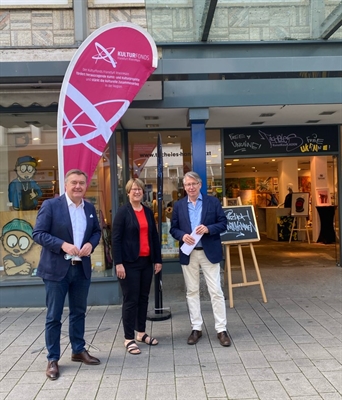 Die Geschäftsführerin des Kulturfonds Frankfurt RheinMain, Karin Wolff, hat zusammen mit Oberbürgermeister Claus Kaminsky und Martin Hoppe, Fachbereichsleiter Kultur der Stadt Hanau, den KunstKaufLADEN Tacheles in der Nürnberger Straße besucht.