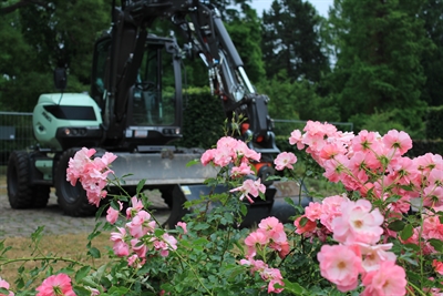 Während der Arbeiten im Rosengarten werden im ersten Schritt die alten Pflanzbereiche abgetragen. Anschließend werden Stauden, Rosen und Gräser gepflanzt.