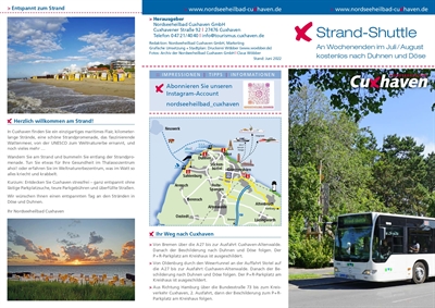 Keine lästige Parkplatzsuche, einfach einsteigen und mit dem kostenlosen Strand-Shuttle entspannt zu beliebten Zielen in Cuxhaven: Mit dieser umweltfreundlichen Sommeraktion startet die Stadt Cuxhaven gemeinsam mit der Nordseeheilbad Cuxhaven GmbH in die Ferien- und Urlaubszeit. An allen Wochenenden der Monate Juli und August – jeweils samstags und sonntags – stellt Cuxhaven in diesem Jahr versuchs- bzw. probeweise einen kostenlosen Strand-Shuttle vom Kreishaus in die bei Cuxhavenern, Urlaubern und Tagesgästen beliebten Stadtteile Döse und Duhnen zur Verfügung. Reisende können somit auf eine zeitintensive Parkplatzsuche verzichten und mit dem „Park and Ride“-Shuttle entspannt in Richtung Strand und Erholung starten.