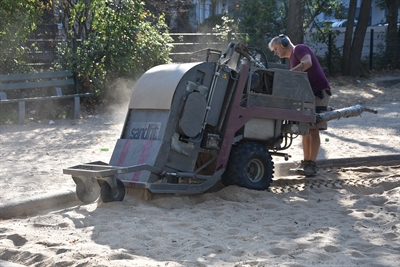 „Bereits seit einigen Jahren setzen wir auf eine jährliche, professionelle Reinigung der städtischen Sandflächen. Dadurch erhalten wir eine gute Sandqualität und müssen das Sediment entsprechend seltener erneuern“, erklärt Stadtrat Thomas Morlock. Für die Arbeit setzen die Fachkräfte ein spezielles Reinigungsgerät ein. Dabei wird der Sand aufgenommen, gesiebt und anschließend wieder in den Sandkasten zurückgeleitet. Der Sand wird dabei bis zu 40 Zentimeter tief bearbeitet. Auch Randbereiche und schwer zugängliche Ecken kann die Fachfirma reinigen.