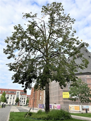 Als die Stadt Hanau sich dazu entschieden hat, die Fläche rund um die Wallonisch-Niederländische Kirche neu zu planen, gab es dabei auch den klaren politischen Willen, eine Linde aus dem Baumbestand zu erhalten. „Teil unserer Entscheidung war es, die Grünpflanzen am Standort zukunftsfähig zu gestalten. Entsprechend blieb nur ein kleiner Teil des Baumbestandes erhalten“, erklärt Stadtrat Thomas Morlock. Ausgerechnet einer dieser Bäume fiel nun den schweren Witterungsbedingungen der vergangenen Jahre zum Opfer: Der erhaltene Lindenbaum muss aufgrund schwerer Schäden sowie eines Pilzbefalls gefällt werden.