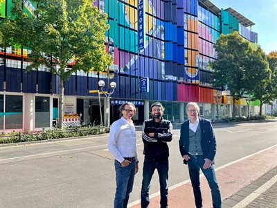 Erstmals hat das Land Hessen in diesem Jahr den Gestaltungs-Wettbewerb „Alles nur Fassade?“ ausgeschrieben, zwei der drei Projekte wurden in Hanau gefördert: Vor dem Parkhaus „Am Forum“ freuen sich (v.l.) Markus Henrich, Geschäftsführer Hanau Parkhaus GmbH, Künstler Engin Dogan und Stadtrat Thomas Morlock über das fertiggestellte Werk.