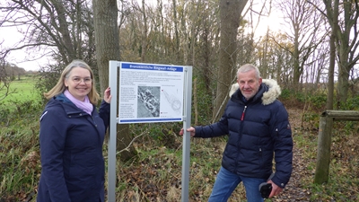 Stadtarchäologin Dr. Christina Wawrzinek und Burkhard Schmidt von der Klaus-Kamp-Stiftung freuen sich über die gelungene Beschilderung des Ringwalls. Wer dem Weg rechts folgt, kommt dorthin. Foto: Stadt Cuxhaven