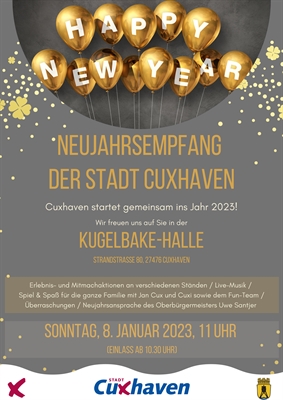 Eine außergewöhnliche Zeit liegt hinter Cuxhaven und den Bürgerinnen und Bürgern sowie Gästen: Zwei Jahre konnte auch der Neujahrsempfang der Stadt Cuxhaven nicht in persönlicher Form stattfinden. Doch nun geht es wieder los: Für Sonntag, 8. Januar 2023, haben sich die Organisatoren um Oberbürgermeister Uwe Santjer etwas ganz Besonderes überlegt. Mit dem überarbeiteten Konzept lädt die Stadtverwaltung alle Cuxhavenerinnen und Cuxhavener sowie Gäste der Stadt jedes Alters in die Kugelbake-Halle ein. Dort erwarten die Besucherinnen und Besucher Erlebnis- und Mitmachaktionen an verschiedenen Ständen, Live-Musik, Überraschungen und Vieles mehr.