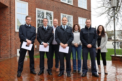 Eine Stufe rauf auf der Karriereleiter der Berufsfeuerwehr geht es auch für Jochen Peschke. Er wurde ins Beamtenverhältnis auf Lebenszeit berufen. Als neue Oberbrandmeister dürfen sich zukünftig Tim Wulff, Thomas Wenzel und Alexander Burmeister betiteln, die sich über ihre Beförderung freuen.