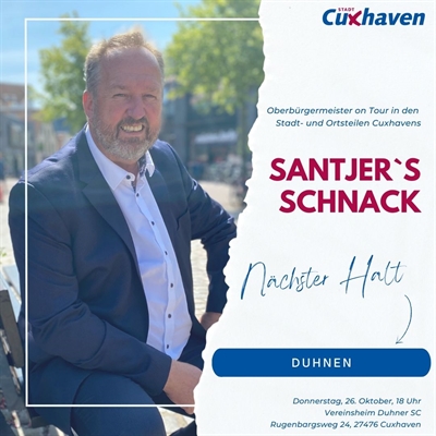 Cuxhavens Oberbürgermeister Uwe Santjer lädt wieder ein: Bei der neunten Station von „Santjer`s Schnack“ möchte das Stadtoberhaupt am Donnerstag, 26. Oktober, ab 18 Uhr mit den Bürgerinnen und Bürgern aus Duhnen in den persönlichen Austausch kommen.