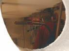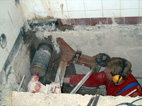 Viele Löcher gibt es derzeit im Rathaus in Bocholt, der innere Kern (komplette Sanitärinstallation) wird saniert. Hier sehen wir einen Mitarbeiter (durch ein Loch geblickt) wie er gerade mit einer großen Bohrmaschine ein weiteres Loch für neue Leitungen bohrt.