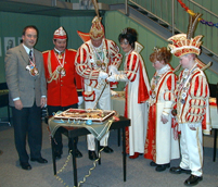 Der Empfang im Bocholter Rathaus am Veilchendienstag hat schon eine lange Tradition: Hier erhalten die Karnevalisten ein deftiges Mittagessen und eine leckere Torte, die stets mit dem Motto des Karnevals geschmückt ist. In diesem Jahr prangten eine Tankstelle und Farbeimer auf der Torte, die das diesjährige Motto des Karnevals "Farbenfrohe Bocholter Narren tanken auf !" in großen Schokoladenlettern auf weißem Marzipangrund verkündete. Freuen durften sich auf den süßen Genuss übrigens die Bewohner des Mutter-und-Kind-Heims. Die Karnevalisten überreichten sie bei ihrem Nachmittagstermin als süße Spende.