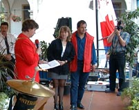 "Sie befinden sich in bester Gesellschaft," so Bürgermeisterin Christel Feldhaar zu Peter und Susanne Wanders, die sich gestern als Segelweltmeister 1999 in der "Flying Junior Klasse" im Goldenen Buch der Stadt Bocholt im Rahmen eines städtischen Empfanges auf dem Platz vor dem Historischen Rathauses eintrugen. Feldhaar verwies in ihrer Rede (diese ist im übrigen im Anschluß an diesen Pressetext abgedruckt) auf den Olympiasieger von 1964 und 1968, Karl-Heinz Henrichs und Jutta Niehaus, die im Jahr 1988 olympisches Silber in Seoul gewann. Teamgeist, Harmonie, Zielstrebigkeit und Leistungsbereitschaft sowie eine innere Ruhe und höchste Konzentration hob Feldhaar als die Eigenschaften hervor, die einen sportlichen Erfolg auch im Segeln garantierten.