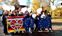 Im Deutsch- und Kunstunterricht hatten die Schüler der beiden Europaklassen 8a und 8b der Hohe-Giethorst-Schule Karten gestaltet und mit Grüßen und Botschaften an Europa versehen. Pünktlich um 13.00 Uhr – zeitgleich mit der Großveranstaltung in Brüssel - ließen sie diese Grußbotschaften in den Himmel steigen. Gleichzeitig präsentierte Schulleiter Andreas Böing im Eingangsbereich der Schule die Wandtafel, mit der die Schule offiziell als Comenius-Schule ausgezeichnet wurde.