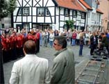 Zunächst hatte Günter Wewel selbst in der romantischen Atmosphäre des Schloss-Innenhofs "Es war einmal" gesungen. Später im Alten Dorf spielte er noch einen Teil der Moderation ein – unter den aufmerksamen Blicken von über 50 Bürgern, die den Kammersänger live erleben wollten. Der Eindruck, den der Sänger und Moderator von den beiden Drehorten gewonnen hat, erfreute die Hertener und Westerholter: "Wir wollen die schönen Seiten der Gegenden zeigen. Und hier ist es wirklich schön", sagte Günter Wewel, nachdem er seinen Part eingespielt hatte. Während der Sänger noch Autogramme schrieb, brachten sich die nächsten Künstler in Position: Die Menskes-Chöre nahmen vor der malerischen Kulisse des Alten Dorfs den Sonnenwalzer auf.