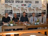 "Die Idee zum Partyservice Open Air in Bocholt entstand in der Nacht nach dem HeimatkulTour-Konzert im Bocholter Brauhaus kurz vor Weihnachten," erinnert sich Bocholts Stadtmarketing-Chef Ludger Dieckhues. "Vor allem der Gedanke, je ein Konzert für zwei unterschiedliche Generationen auf einer Bühne am Bocholter Hünting durchzuführen, hat uns fasziniert." Zudem komme man gerne dem Ruf der Jugend in der ganzen Umgebung nach, in der Region Westmünsterland einmal ein richtiges Highlight für die Jugendszene zu veranstalten, so Bocholt’s Bürgermeister Klaus Ehling, der es sich nicht nehmen ließ, selbst zur Pressekonferenz zu kommen. "Ich verstehe zwar selber von der Musik nichts, aber das ist eigentlich ein untrügliches Zeichen, dass es genau richtig für unsere Jugendlichen ist," so Ehling, "und jetzt weiß ich auch, dass PartyService etwas anderes ist, als heiße Würstchen zu servieren. Wir sind froh, dass wir in Bocholt für den gesamten Umraum ein derartiges Ereignis auf die Beine stellen können. Mein Dank gilt an dieser Stelle aber insbesondere den Sponsoren, ohne die derartiges heutzutage nicht mehr möglich ist".