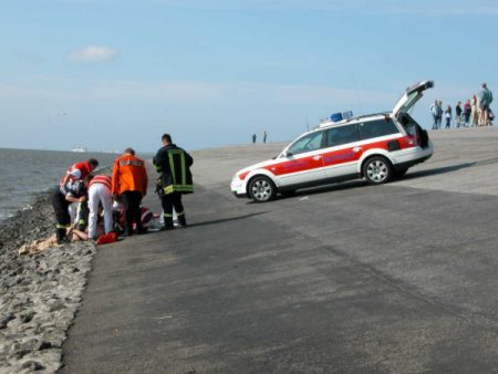 3 Fahrzeugen rückten in kurzen Abständen aus: Rüstwagen, Löschgruppenfahrzeug LF16TS mit Mehrzweckboot und Löschgruppenfahrzeug LF16. Als der Rüstwagen zusammen mit dem ersten Fahrzeug des Rettungsdienstes eintraf, war eine männliche Person bereits aus dem Wasser geholt worden. Wie sich dann herausstellte, hatten zwei Mädchen im Alter von 8 und 10 Jahren ihren Opa beim Baden beobachtet und bemerkt, dass dieser plötzlich keine Bewegung mehr machte. Es gelang den beiden Mädchen, den Mann in die Nähe des Deiches zu ziehen, wo ihnen ein Erwachsener zu Hilfe kam und die Person aus dem Wasser holen konnte.