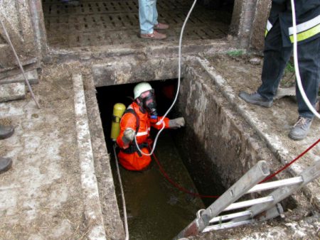 Einstieg in die Güllegrube unter schwerem Atemschutz