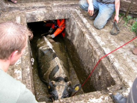 Am 11. Juni um 16.38 Uhr wurde die Drehleiter der Feuerwehr Norden zur Unterstützung der Feuerwehr Hage nach Blandorf-Wichte gerufen. Kurze Zeit später wurde auch noch der Rüstwagen nachalarmiert. Auf dem Hof Freesemann war eine Kuh am Eingang eines Stallgebäudes in die Öffnung der sich unter dem gesamten Stall hinziehenden Güllegrube geraten und in Panik ca 25m unter dem Stall durchgelaufen.
