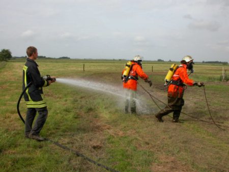 Erst nach Aufheben einer Betonbodenplatte im Stall war das Tier so weit zugänglich, dass ein Tau befestigt werden konnte. 2 Feuerwehrleute stiegen unter schwerem Atemschutz und mit Leinen gesichert in die ca. 1/2m hoch stehende Gülle und arbeiteten sich zu dem Tier vor. Mit Hilfe von Seilen und einem Trecker konnte das Tier dann wieder auf festen Boden gebracht werden. Anschließend war eine große Säuberungsaktion für Mensch und Tier angesagt, bei der das Tanklöschfahrzeug der Feuerwehr Hage gute Dienste leistete.