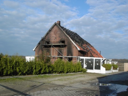Kaum waren die letzten Fahrzeuge nach dem Einsatz bei der Gaststätte wieder im Feuerwehrhaus, als um 02.25 Uhr ein neuer Brand gemeldet wurde. Es brannte ein Einfamilienhaus im Gewerbegebiet Leegemoor. Als wir eintrafen, schilderte ein Feuerwehrmann, schlugen die Flammen bereits aus Dach und vielen Fenstern. Trotz des Großeinsatzes und einer sehr guten Wasserversorgung in der Umgebung brannte das Haus nahezu vollständig aus. Zur schnellen Brandausbreitung hat auch wohl beigetragen, dass alle Decken aus Holz waren.