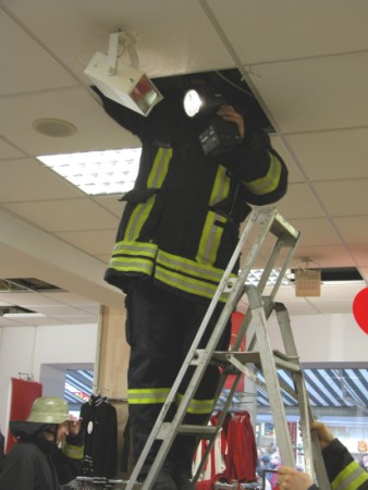 Am 1. November um 10.20 Uhr wurde die Feuerwehr Norden nach Auslösung der Brandmeldeanlage im Kaufhaus Ceka, Osterstraße alarmiert. Beim Betreten des Verkaufsraumes konnte Brandgeruch wahrgenommen werden, dessen Quelle aber zunächst nicht feststellbar war. Die abgehängte Deckenkonstruktion wurde an mehreren Stellen durch öffnen der eingelegten Platten kontrolliert, besonders im Bereich der eingebauten Leuchtstofflampen.