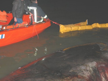 Nach einigen ruhigen Tagen gab es am 4. Dezember um 19.10 Uhr einen Einsatz für das Boot der Feuerwehr Norden. Nachdem der Rettungskreuzer "Bernhard Gruben" der DGzRS nun den zweiten im Wattenmeer gestrandeten Wal in den Norddeicher Osthafen geschleppt hatte, wurde auch dieser bis zur Bergung mit einer Ölsperre umgeben, die mit Hilfe des Feuerwehrbootes ausgelegt wurde. Der Einsatz dauerte etwa 1-1/2 Stunden.