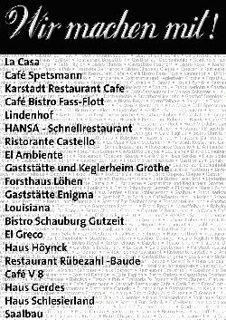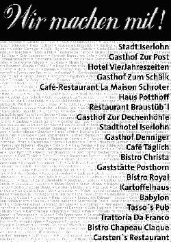 "Wir machen mit - Wir bieten ein alkoholfreies Getränk günstiger an als alkoholhaltige Getränke" Laut Gaststättengesetz muss mindestens ein alkoholfreies Getränk nicht teurer angeboten werden, als das billigste alkoholische Getränk gleicher Menge. In Iserlohn will man noch mehr. Die Plakataktion soll bewirken, dass zukünftig in den Gaststätten und Restaurants der Waldstadt ein alkoholfreies erkennbar billiger angeboten wird, als alkoholische Getränke. Und neben der Stadt Iserlohn sind schon neununddreißig Iserlohner Gastronomiebetriebe dabei: Gasthof Zur Post, Hotel VierJahreszeiten, Gasthof Zum Schälk, Café-Restaurant La Maison Schroter, Haus Potthoff, Restaurant Braustüb́l, Gasthof Zur Dechenhöhle, Stadthotel Iserlohn, Gasthof Denniger, Café Täglich, Bistro Christa, Gaststätte Posthorn, Bistro Royal, Kartoffelhaus, Babylon, Tassós Pub, Trattoria Da Franco, Bistro Chapeau Claque, Carsteńs Restaurant, La Casa, Café Spetsmann, Karstadt Restaurant Cafe, Café Bistro Fass-Flott, Lindenhof, HANSA - Schnellrestaurant, Ristorante Castello, El Ambiente, Gaststätte und Keglerheim Grothe, Forsthaus Löhen, Gaststätte Enigma, Louisiana, Bistro Schauburg Gutzeit, El Greco, Haus Höynck, Restaurant Rübezahl-Baude, Café V 8, Haus Gerdes, Haus Schlesierland und der Saalbau. Jetzt soll plakatiert werden. In den nächsten Tagen wird das Aktionsplakat - ein Strohhalm zwischen roten Lippen unter dem Motto “Wir machen mit” - an Litfaßsäulen und anderen Flächen im Stadtgebiet aufgehängt, ergänzt um zwei Zusatzplakate mit den Namen der Gaststättenbetriebe, die schon dabei sind. “Je mehr Gastwirte sich melden, umso mehr Zusatzplakate wird es geben und umso größer werden der Erfolg und die Wirkung unserer Aktion sein”, fordert Jürgen Lensing vom Bereich Jugend, Schule, Sport der Stadt weiter zum Mitmachen auf. Weitere Informationen gibt es bei ihm unter Tel. 02371/217-2232. |