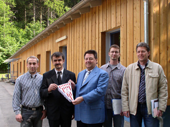 Bei der Übergabe des wieder hergerichteten Umkleidegebäudes gab es für Bürgermeister Klaus Müller einen Wimpel des VTS Iserlohn (vo. li. Enver Sentürk und Sabri Cevik vom VTS, Bürgermeister Klaus Müller, Thorsten Wattenberg (KIM) und Ralf Horstmann vom Sportbüro)