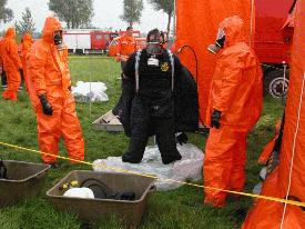 Realitätsnah wurden die unter CSA eingesetzten Kräfte nach ihrem Einsatz vom ABC-Zug in Empfang genommen. Die "verseuchte" Kleidung wurde abgelegt und zur weiteren Behandlung in Kunststoffbeuteln gesammelt. Im Zelt konnte dann geduscht werden, um auch die letzten Reste einer möglichen Kontaminierung zu beseitigen.