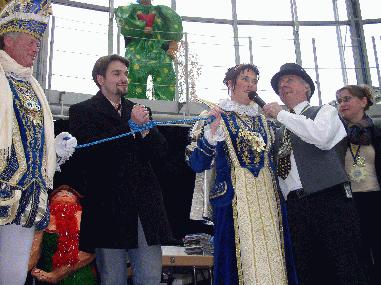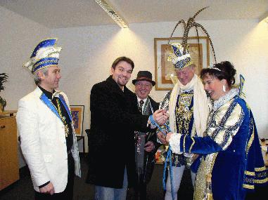 Gegen den Preis von 75 Liter Bier und einigen Flaschen Sekt konnte sich der Hertener Bürgermeister Dr. Uli Paetzel heute nach längerer Verhandlung mit den Tollitäten, aus der Weiberfastnacht-Veranstaltung im Hertener Glashaus wieder frei kaufen. Der Bürgermeister war zuvor von der Hertener Karnevalsprinzessin Conny I. im Rathaus in Fesseln gelegt worden und ins Glashaus entführt worden. Die dort feiernden Närrinnen und Narren stimmten dem Urteil mit einem dreifachen "Herten-Helau" zu. Die Beute soll, so war zu vernehmen, unter allen Anwesenden verteilt werden und noch heute verköstigt werden.